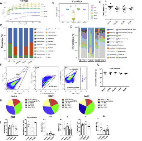 清除肿瘤内的微生物会阻碍肿瘤的转移,但不会阻碍原发肿瘤的生长通过测试不同的抗生素组合和给药途径来选择性地消除肿瘤驻留或肠道微生物群(图3A)。研究发现使用鸡尾酒抗生素(ATBx),通过饮用水(DW)可以有效清除肠道和肿瘤微生物菌群。当ATBx经尾静脉静脉注射时,肿瘤菌群被清除,而肠道菌群保持完整(图3B和3C)。通过DW给药穿透细胞膜的抗生素多西环素具有与ATBx-IV相似的效果(图3B和3C)。最重要的是,ATBx-IV和Dox-DW处理在肠道活菌数量、肠道微生物群谱和肿瘤免疫谱方面与对照组保持相当(图S3A S3D和S3F S3I)。结果发现ATBx-DW能有效地减缓自发MMTV-PyMT BTs的肿瘤生长(总肿瘤重量为15±对照组为0.5g,而ATBx-DW为11±0.8g),而单独用ATBx-IV或Dox-DW消除肿瘤微生物群并不影响肿瘤总重量(图3D)。这表明肠道菌群在肿瘤生长中起着重要作用,而肿瘤菌群则不然。
